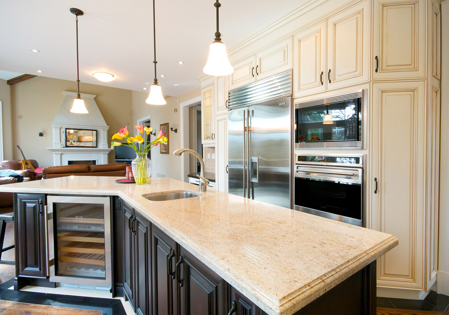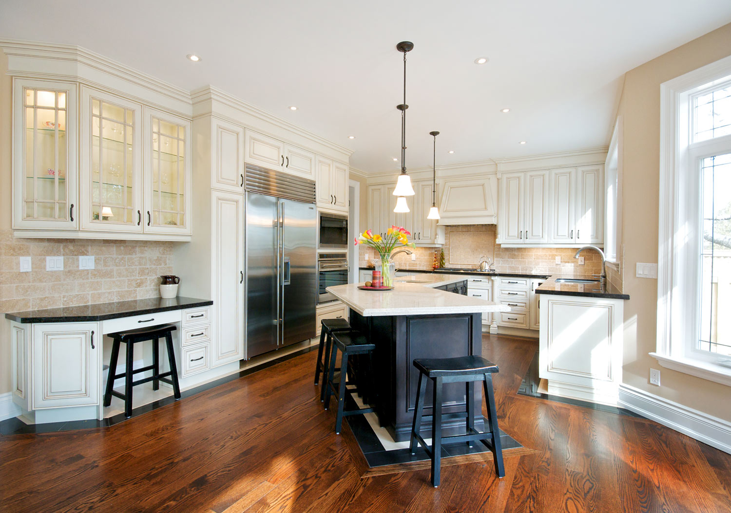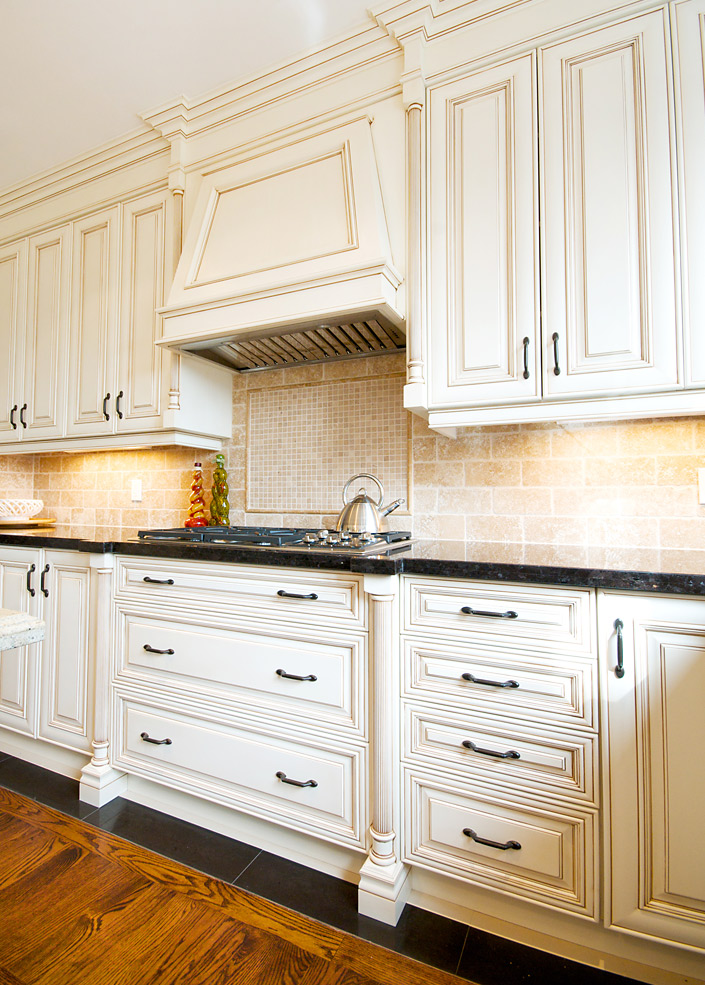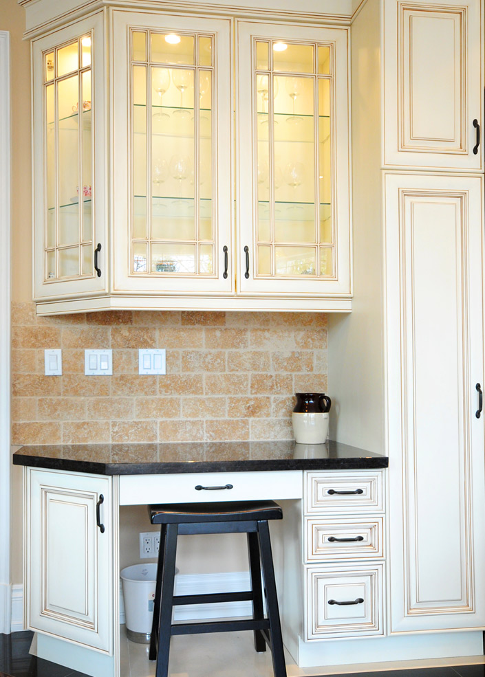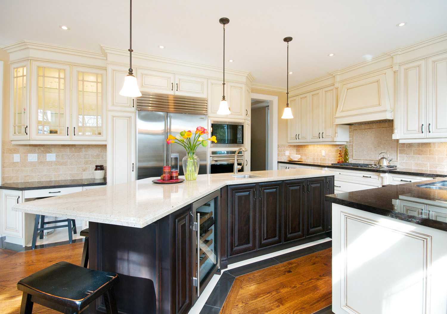 Beautiful custom made wood white kitchen, combined with a perfect dark stain island to give a perfect balance. This kitchen has a custom canopy decorated with corbels, double spice pull outs, dark stain glazed doors beside the canopy and an integrated kitchen desk which matches with the island and ceiling beams colour.