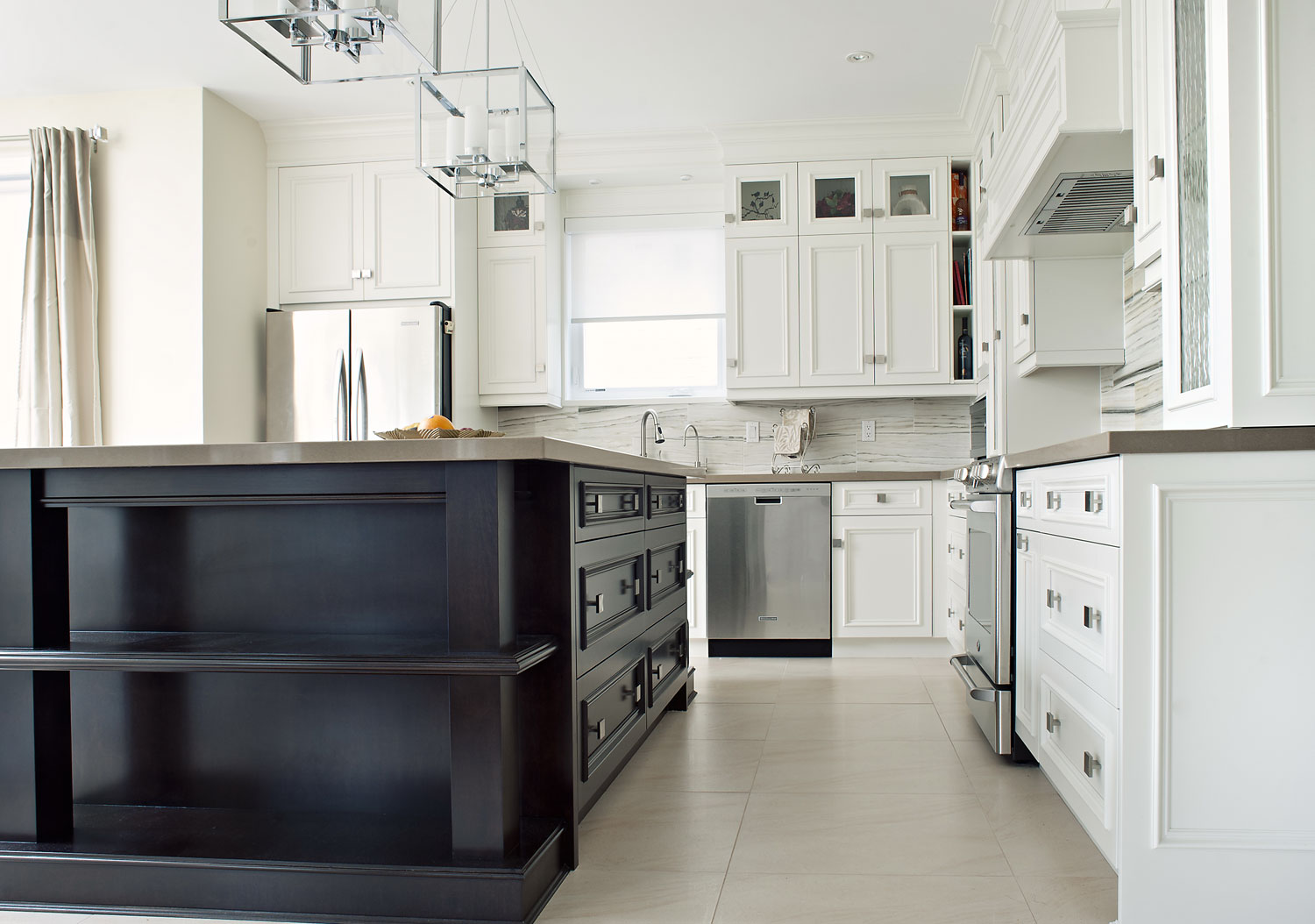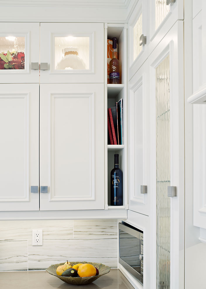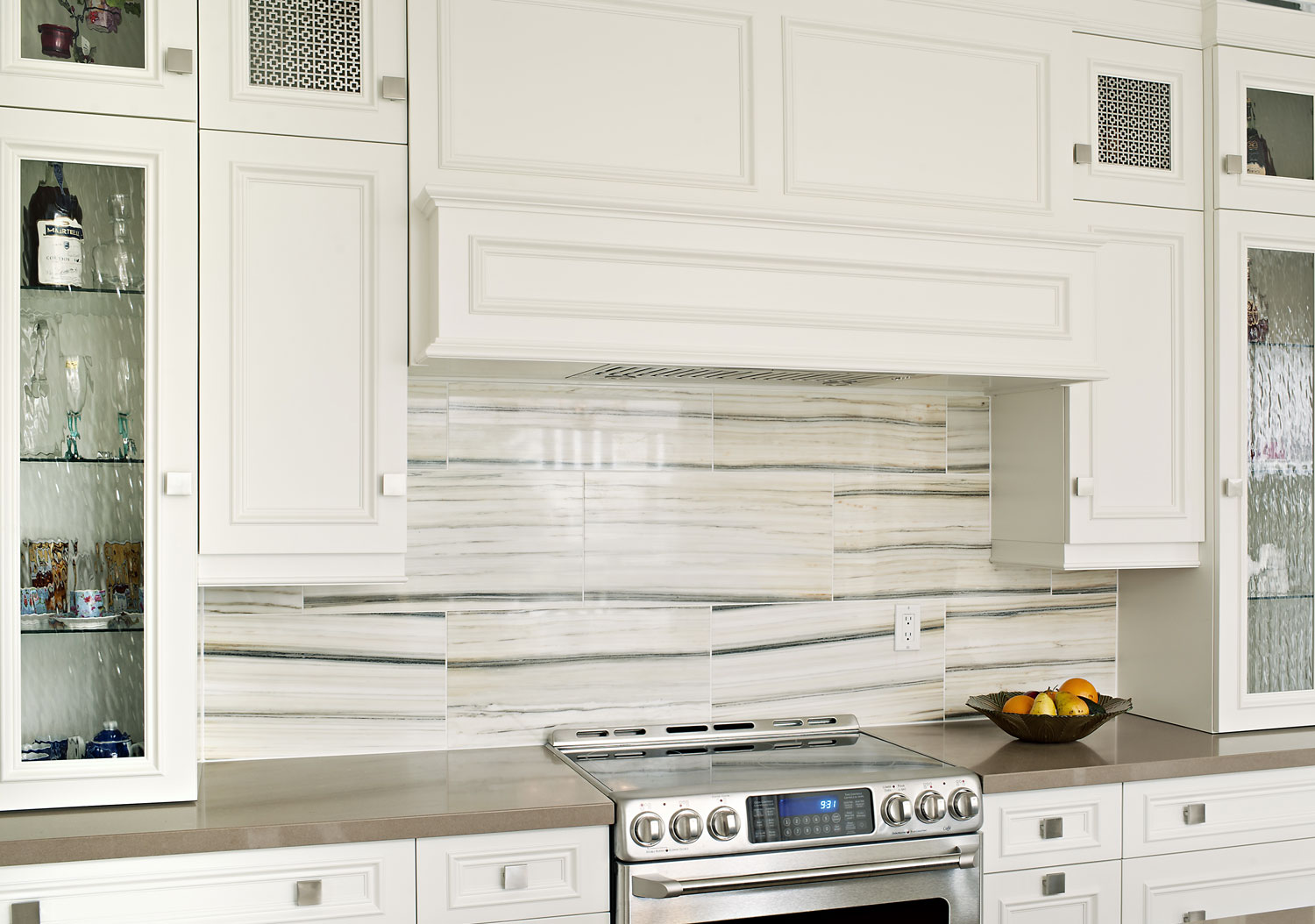 Beautiful transitional kitchen, with custom canopy, hutch upper cabinets sitting on the countertop with waterglass doors, two of the double upper doors had a custom perforated steel mesh. The kitchen had a dark stained island with open display shelving on both sides.