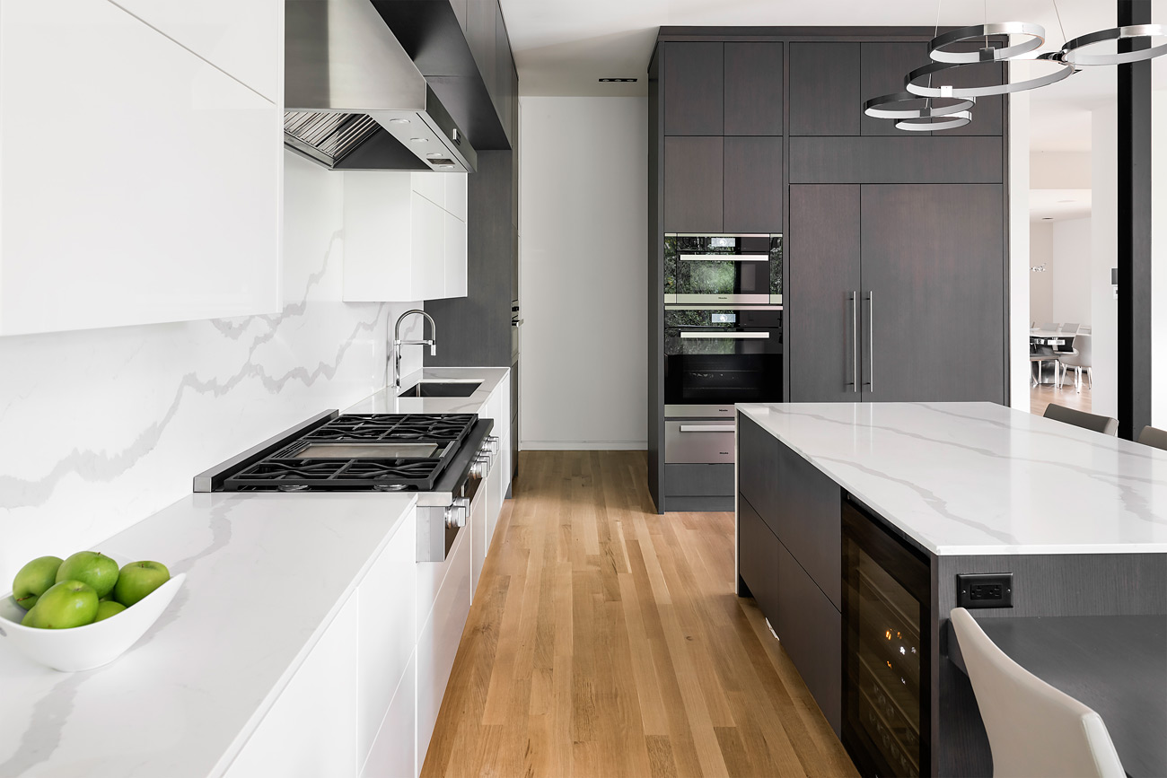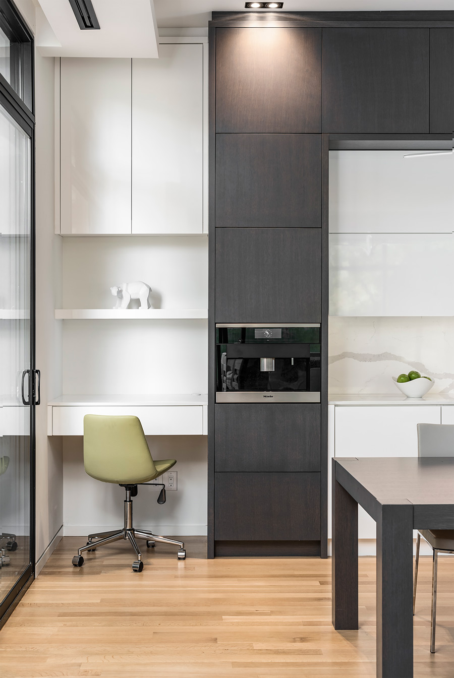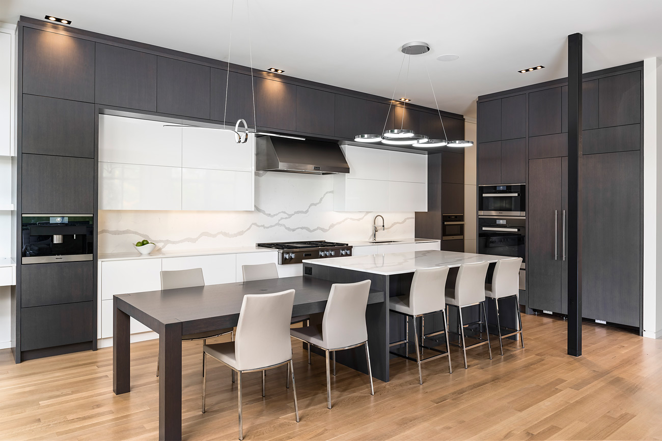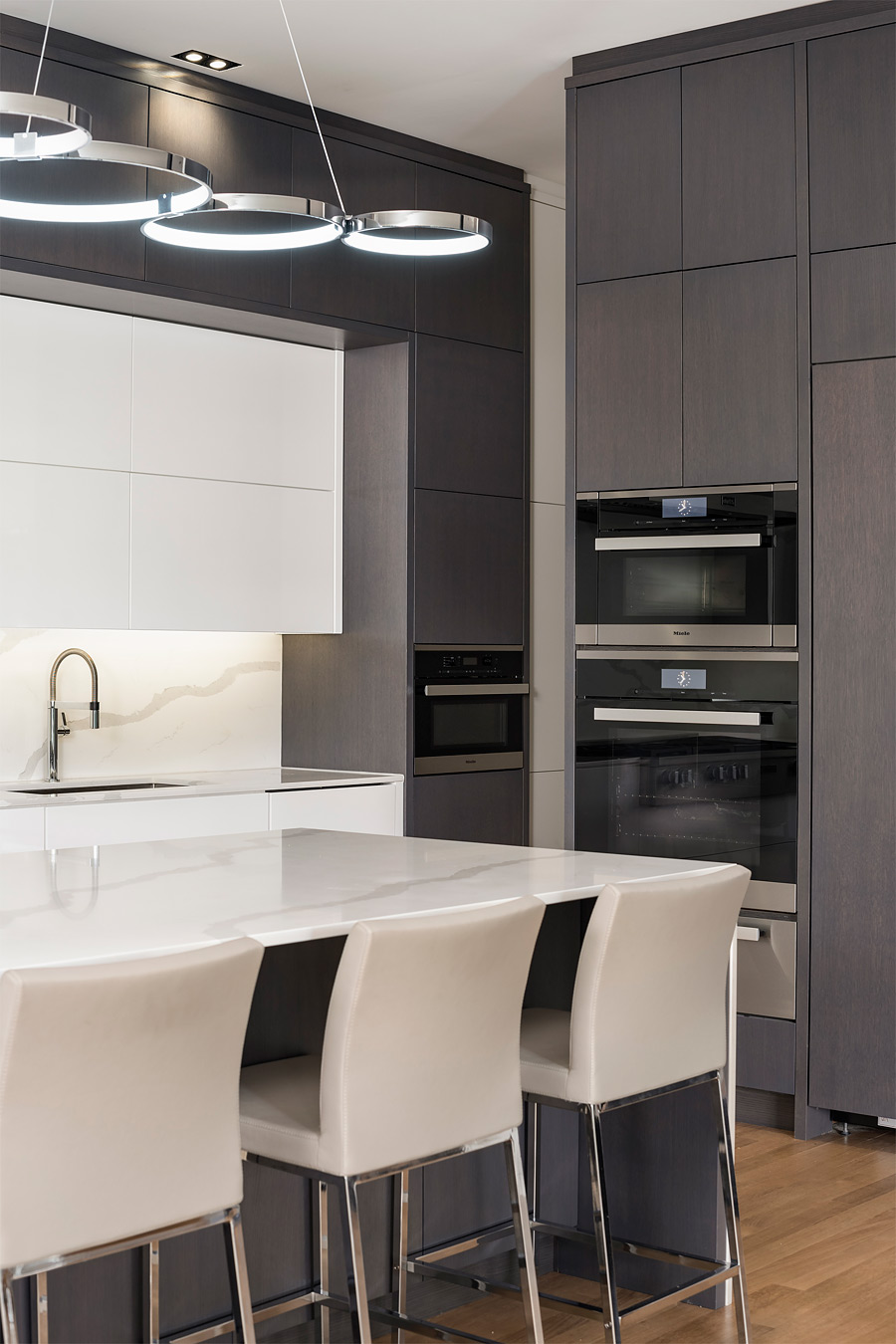 Kitchen was made from a combination of stained white oak veneer and a high gloss polyester coating on a HDF core. All the doors and drawers were fully automated with BLUMs Aventos SERVO DRIVE mechanism eliminating all exterior hardware. This modern project called for clean lines and was made from high-end finishes and materials.