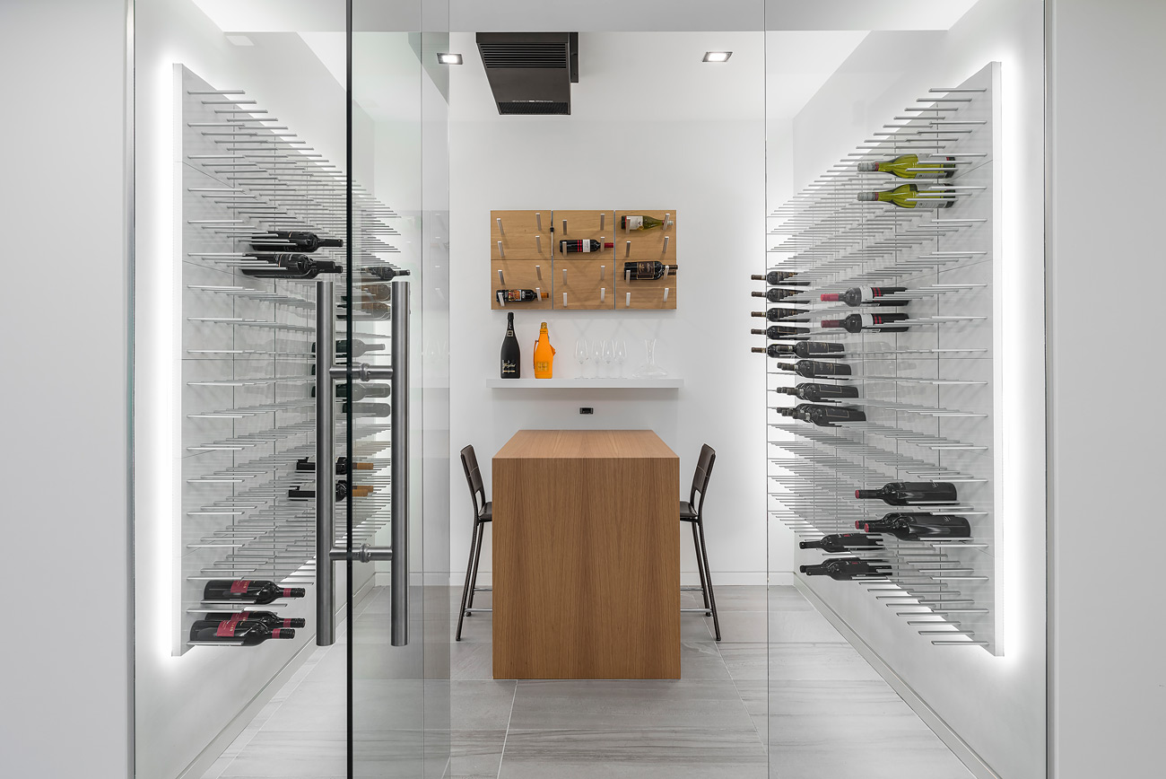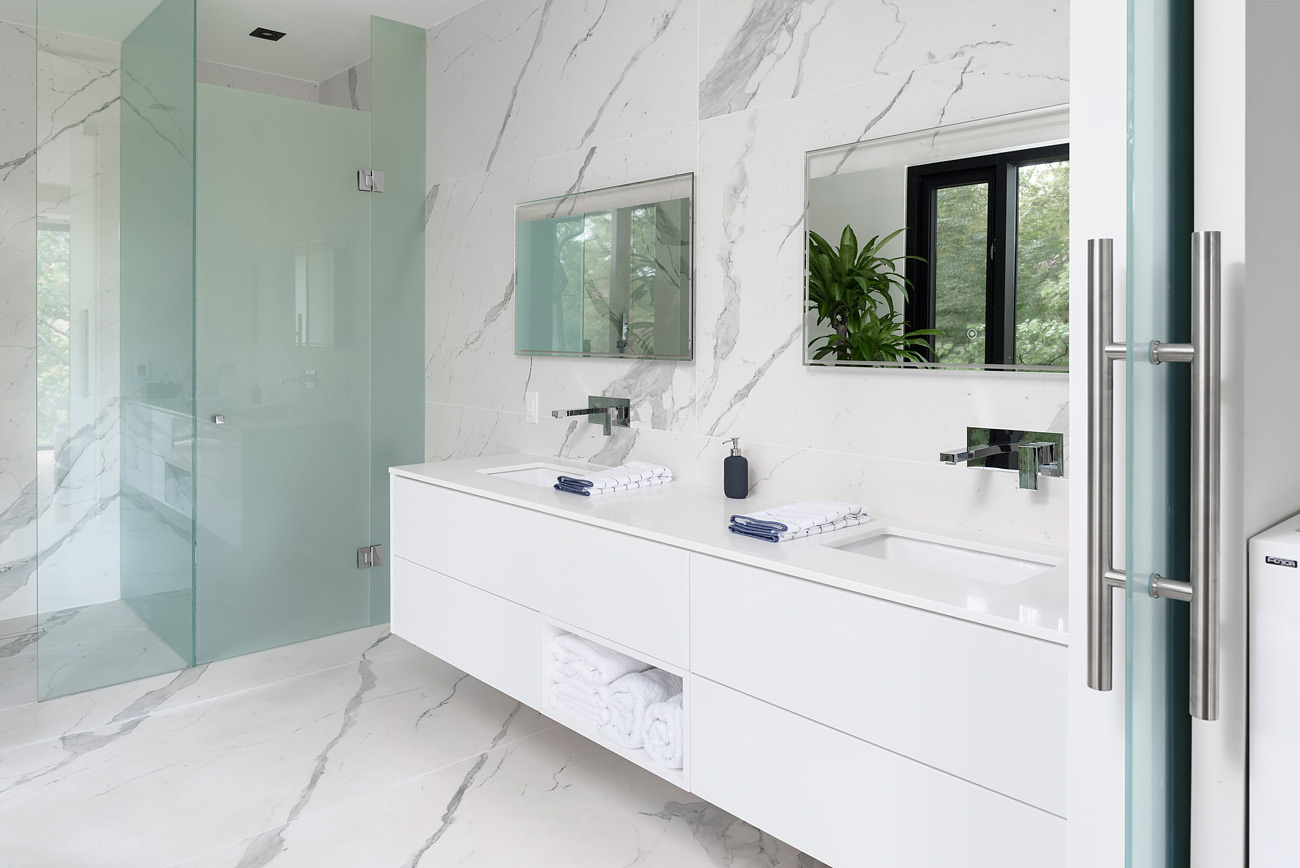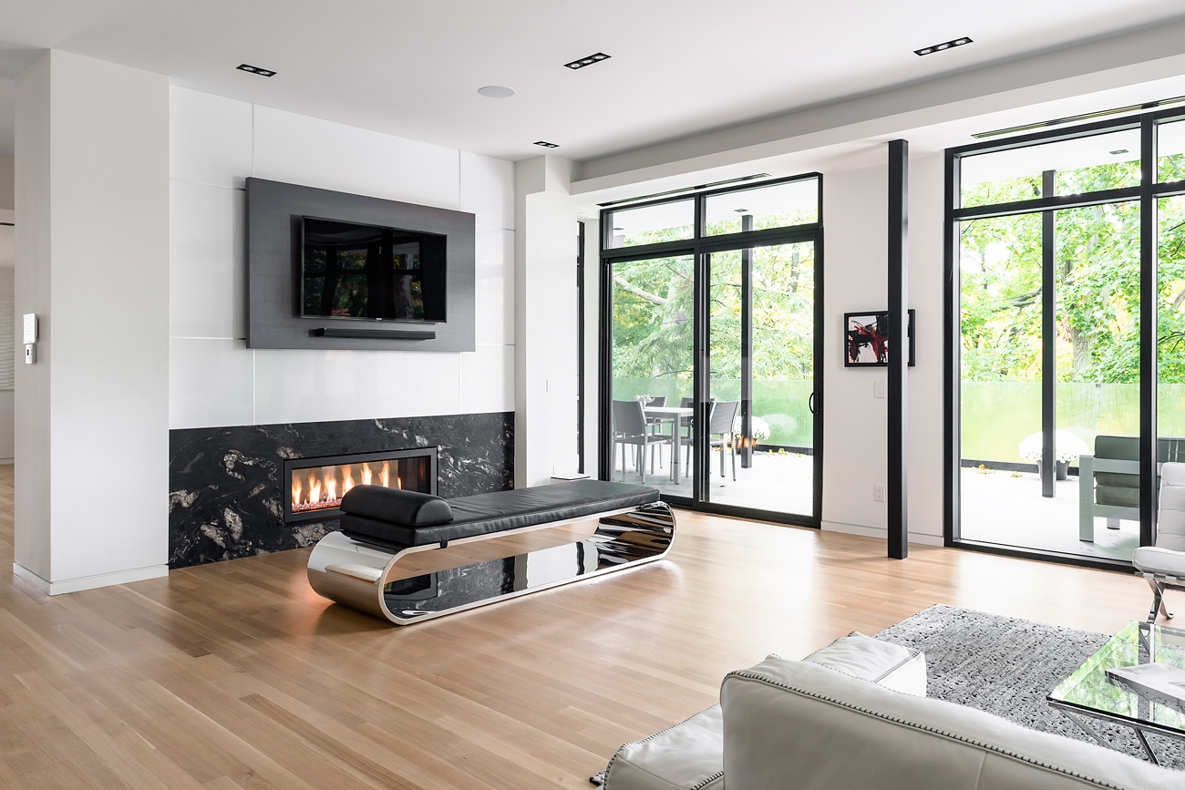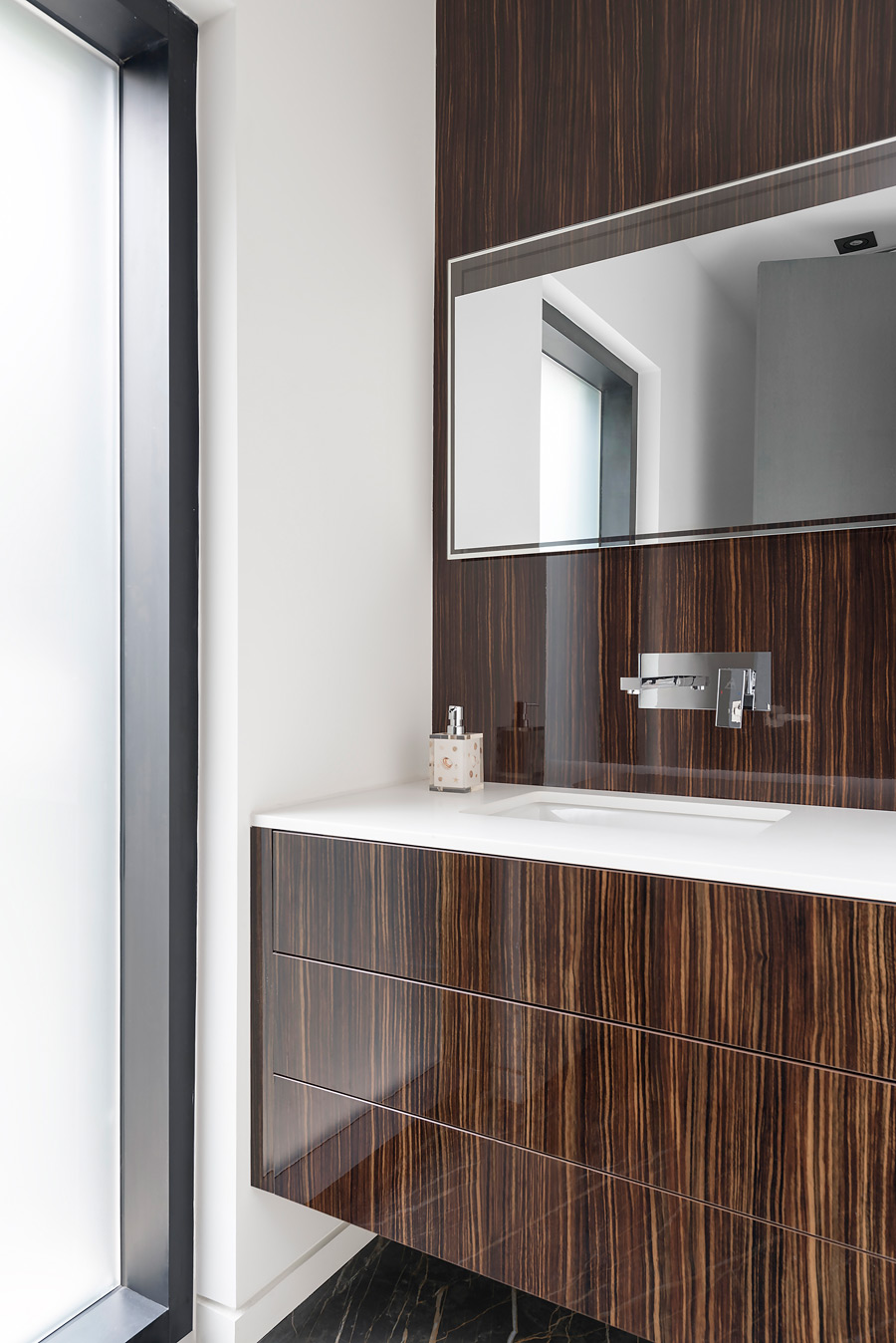 Kitchen was made from a combination of stained white oak veneer and a high gloss polyester coating on a HDF core. All the doors and drawers were fully automated with BLUMs Aventos SERVO DRIVE mechanism eliminating all exterior hardware. This modern project called for clean lines and was made from high-end finishes and materials.