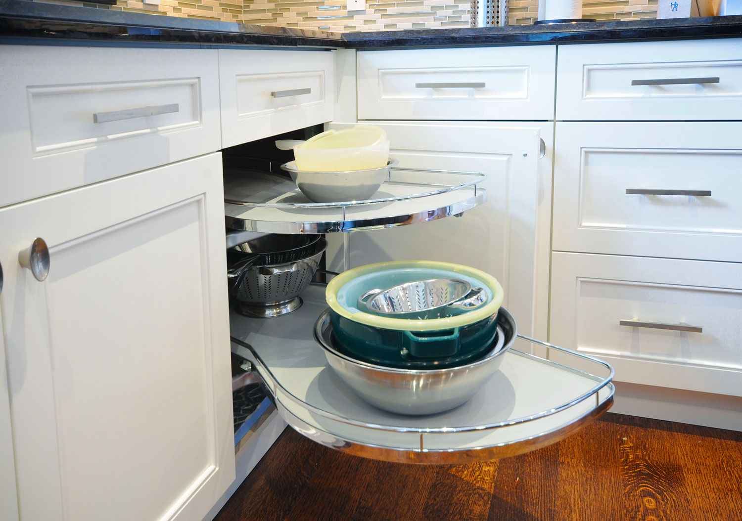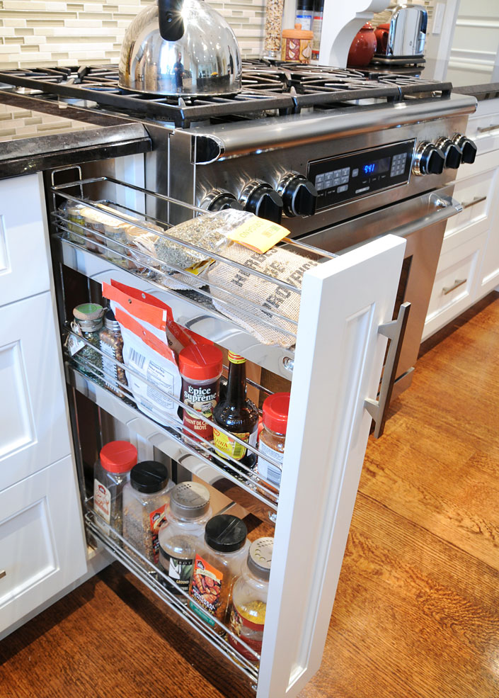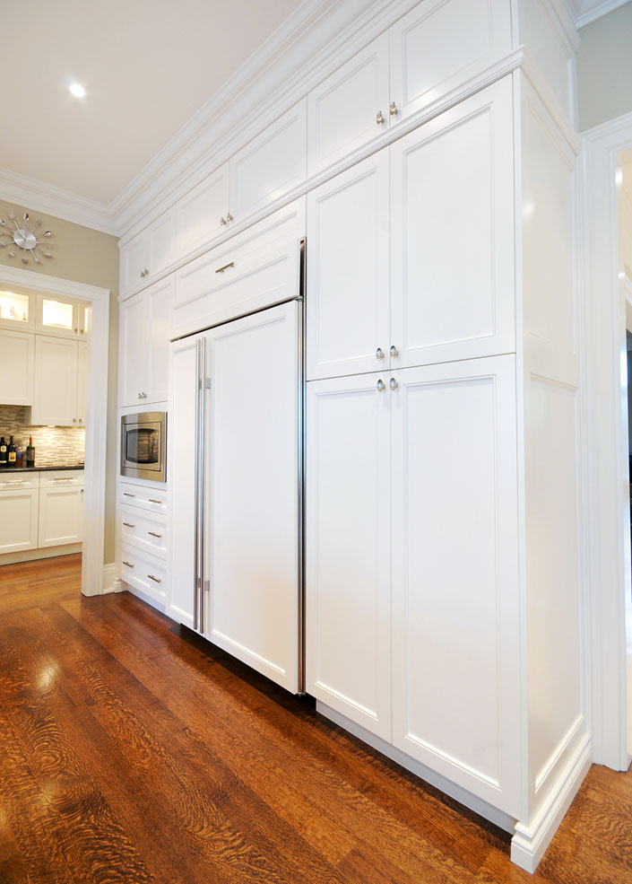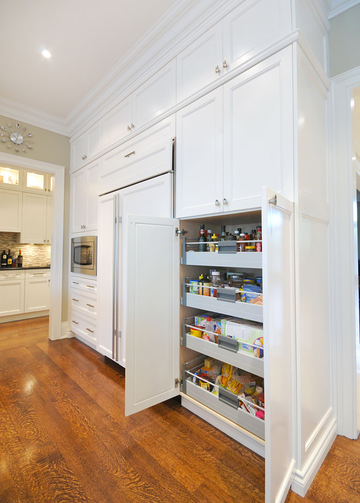 Custom transitional kitchen finished to 10′ ceilings. Cabinetry finished with a Cloud White Benjamin Moore match. Corner base cabinet had a lemans corner pullout, the pantries also had roll-out shelves behind the doors. Walk-through pantry behind the stove wall had matching doors and finish.