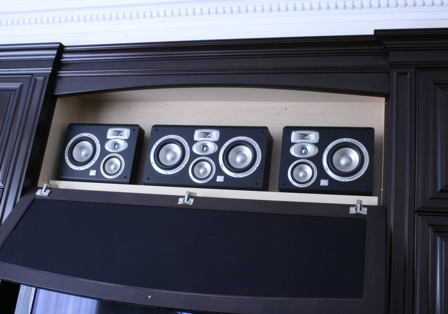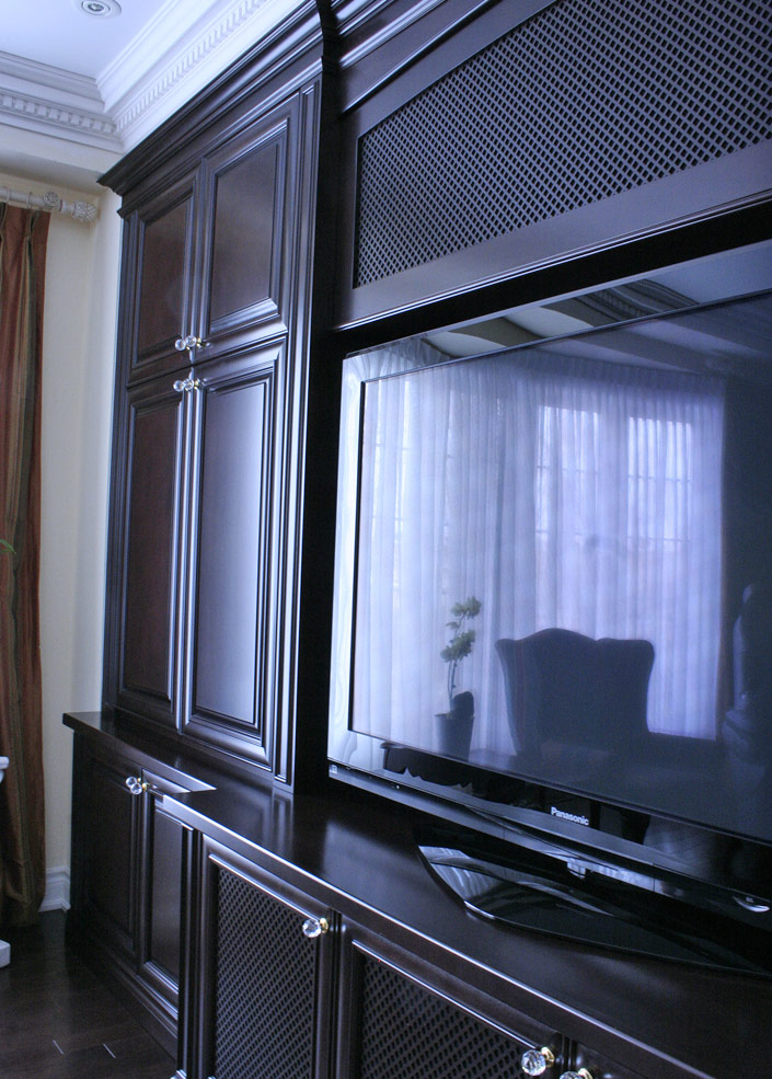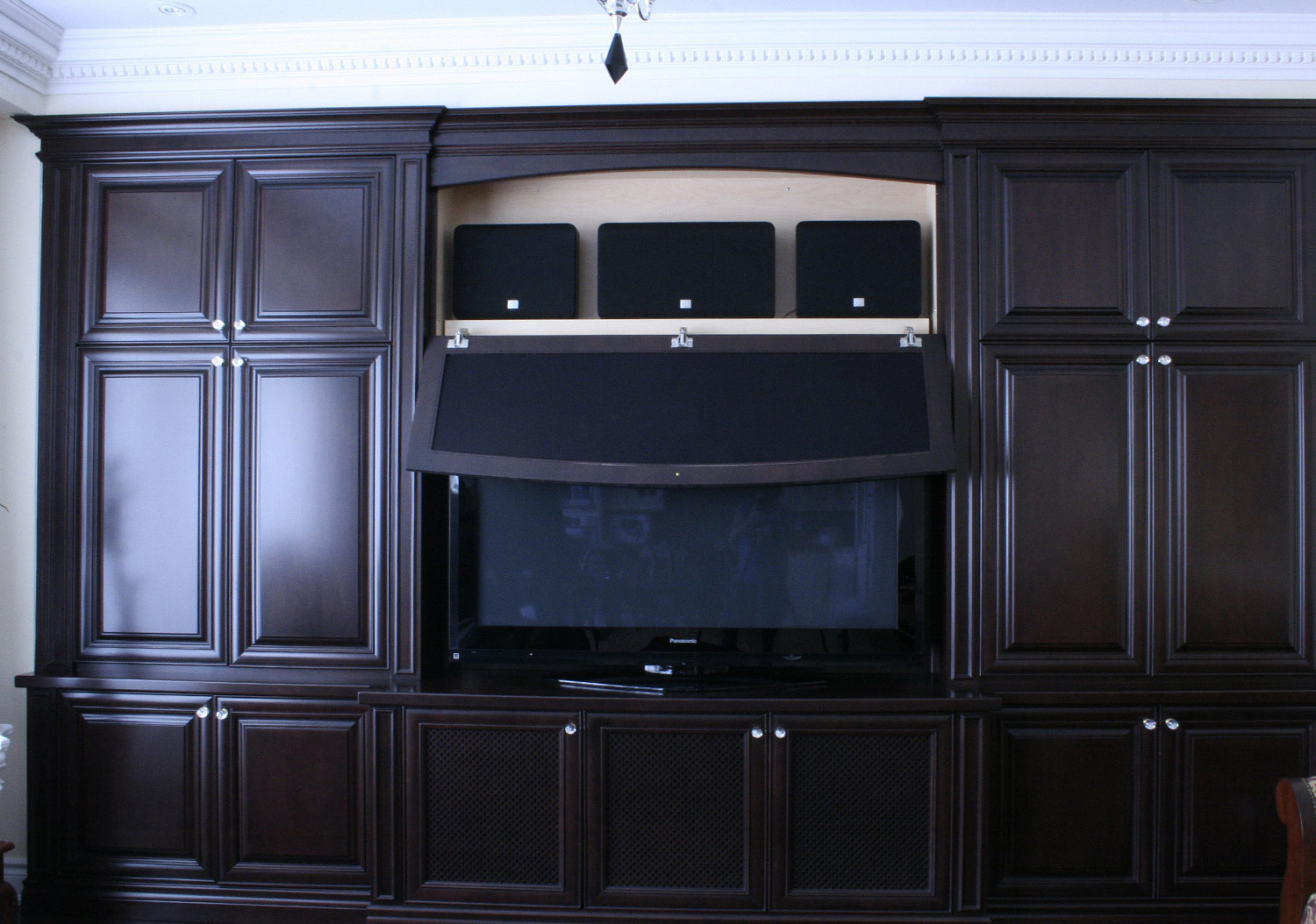 All custom media built-ins are made to TV and Media component specifications. Frequently the built-ins are a combination of open and closed door Storage. It isn’t uncommon to see a custom fireplace mantle incorporated into the design as well.